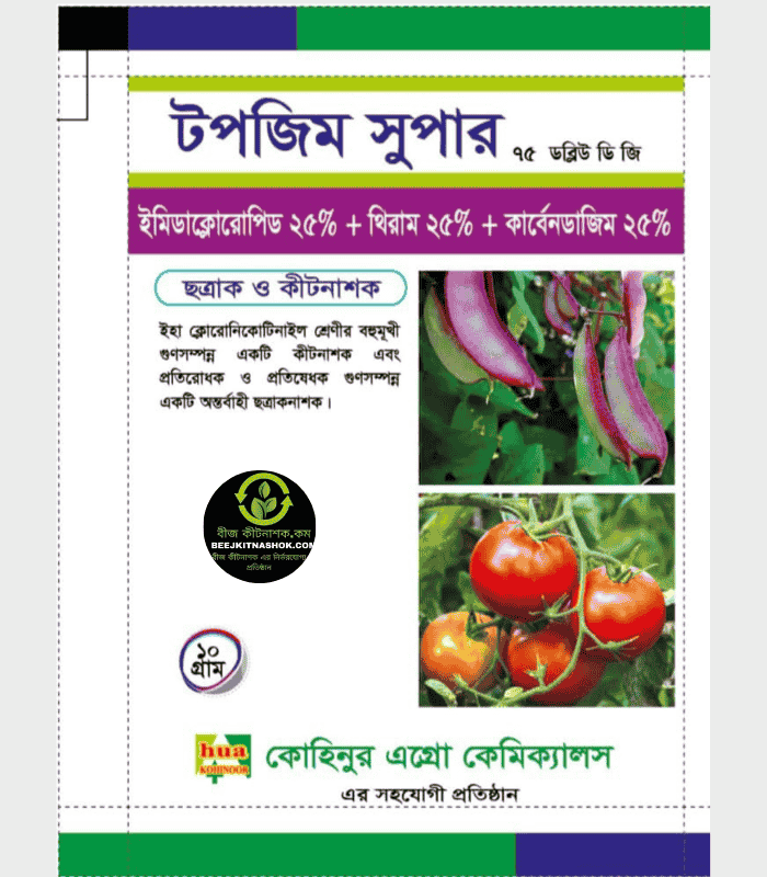 Topzim Super 75WDG একটি শক্তিশালী সিস্টেমিক ছত্রাকনাশক (Systemic Fungicide), যা ফসলের বিভিন্ন ছত্রাকজনিত রোগ দ্রুত নিয়ন্ত্রণ ও দীর্ঘস্থায়ী সুরক্ষা প্রদান করে। উন্নতমানের 75% WDG (Water Dispersible Granule) ফর্মুলেশন হওয়ায় এটি পানিতে সহজে মিশে যায় এবং গাছের ভেতরে দ্রুত ছড়িয়ে পড়ে। ফলে রোগের বিস্তার রোধ করে এবং আক্রান্ত অংশ পুনরুদ্ধারে সহায়তা করে।